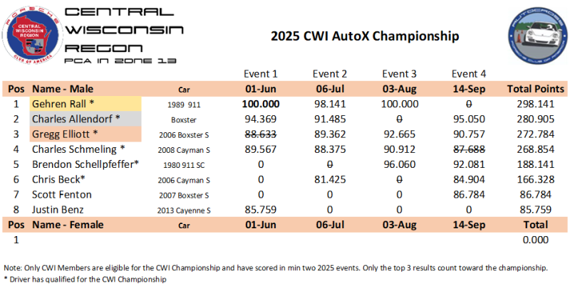 How do we determine the Champions? At each event, all participants will be scored in one class (open). Only CWI members driving Porsche vehicles are eligible for the CWI Championship. The fastest overall (CWI or non-CWI) time at each event will be awarded 100 points and used as the bases time; all other participants will be scored as follows: Winning (base) time/participants time X 100 (WT/ET*100)